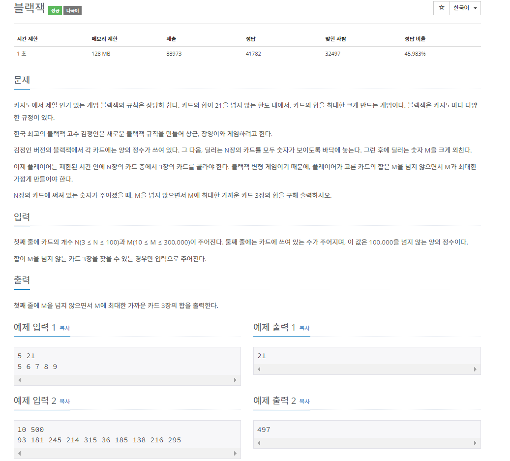 [Python] 백준 2798번(블랙잭) 문제 풀이 본문