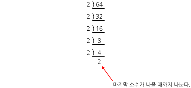 위 그림이 소인수분해의 원리인데, 가장 작은 소수로 계속 나누어서 마지막 소수가 나올 때까지 나누고, 나눈 소수를 곱으로 연결해주는 것이죠. 위 그림의 64는 2 * 2 * 2 * 2 * 2 * 2 이니 2^6으로 나타낼 수 있겠죠.