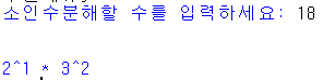 다른 예를 들어 볼까요? 18을 소인수분해한다고 하면 2가 하나, 3이 두개이니 2^1 * 3^2 로 나타낼 수 있습니다.