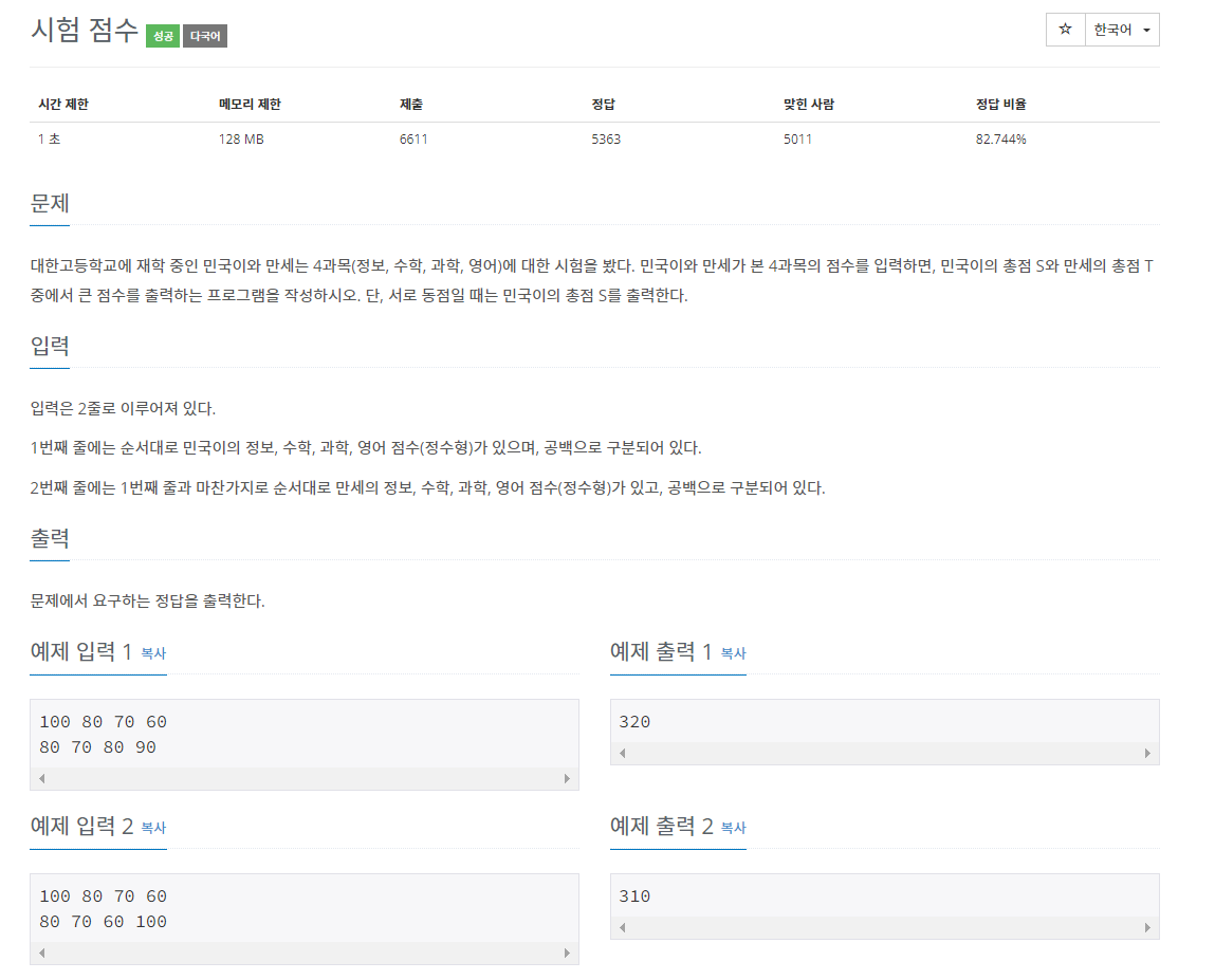 [Python] 백준 5596번(시험 점수) 문제 풀이 본문