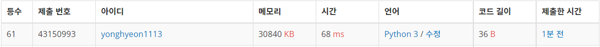 숏코딩을 위해 이렇게도 한번 짜봤다. 1줄코드. 덕분에 코드 길이가 66B에서 36B로 30B나 줄어들었다.