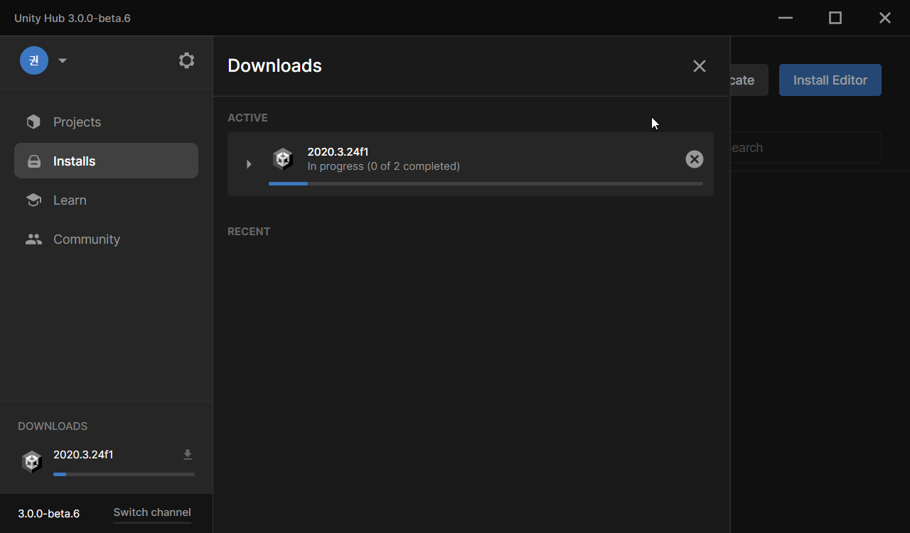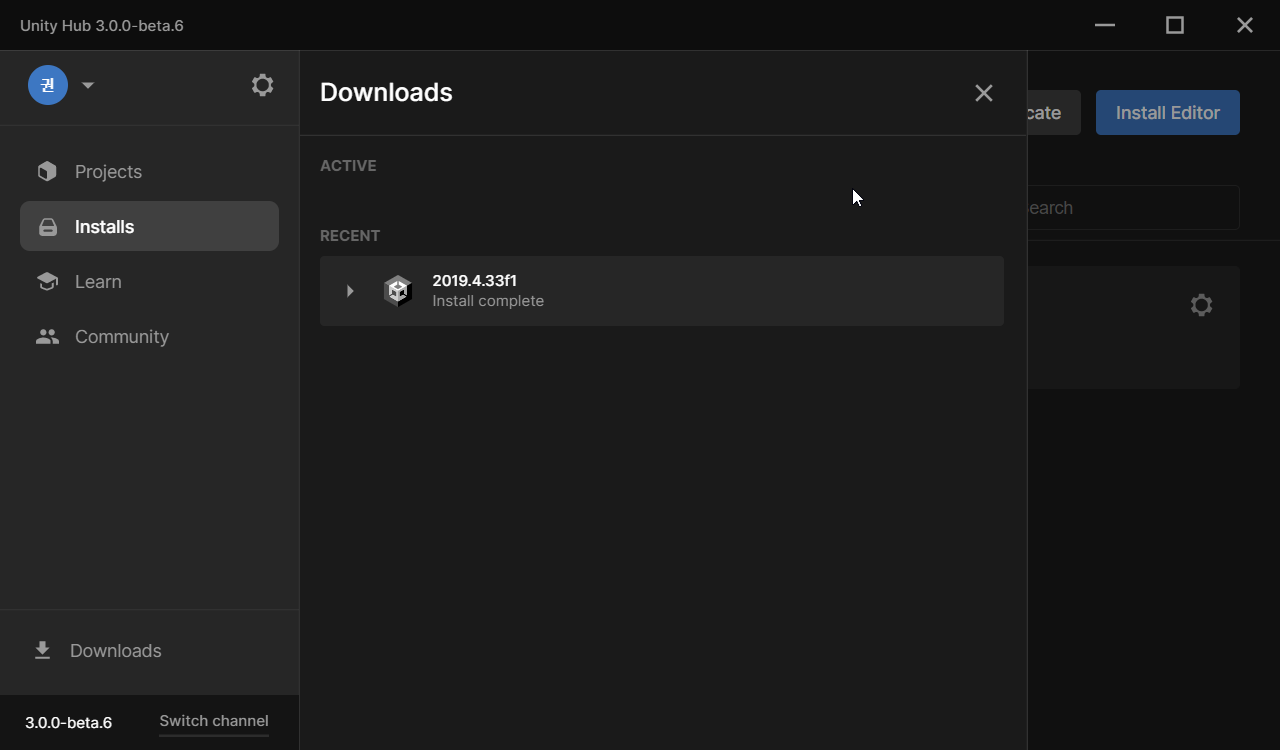 근데 이유는 모르겠지만 저는 설치가 실패했습니다. 구글링해봐도 잘 모르겠어서 2019.4.33f1 버전으로 다시 설치해 주었습니다.