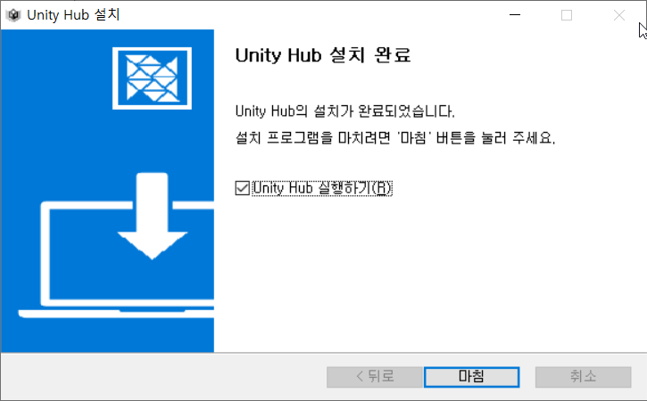 설치 완료! 이제 Unity Hub를 실행시킵시다. <Unity Hub 실행하기>를 선택하신 후 <마침>을 눌러 주시거나, 아니면 직접 Unity Hub에 들어가시거나 하시면 됩니다.