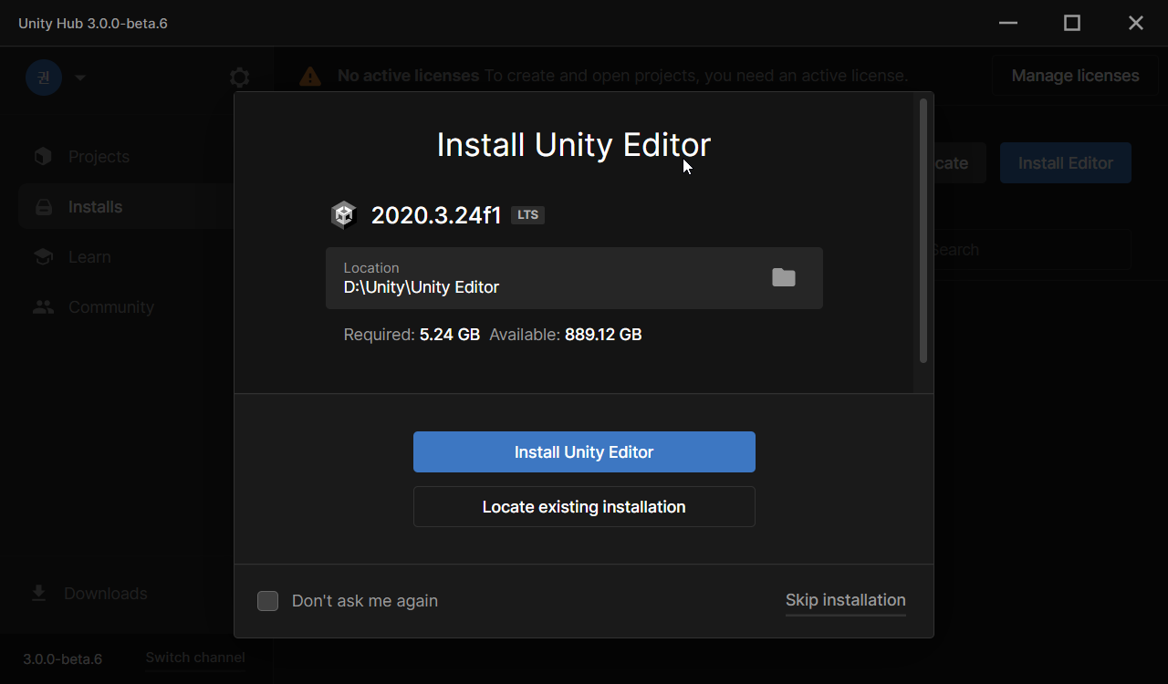 와 아까 사이트도 그렇고 디자인 진짜 잘했네요... 암튼 로그인하면 이런 창이 뜰 텐데, 설치될 위치를 지정해 주신 뒤 <Install Unity Editor>을 클릭해 줍시다.