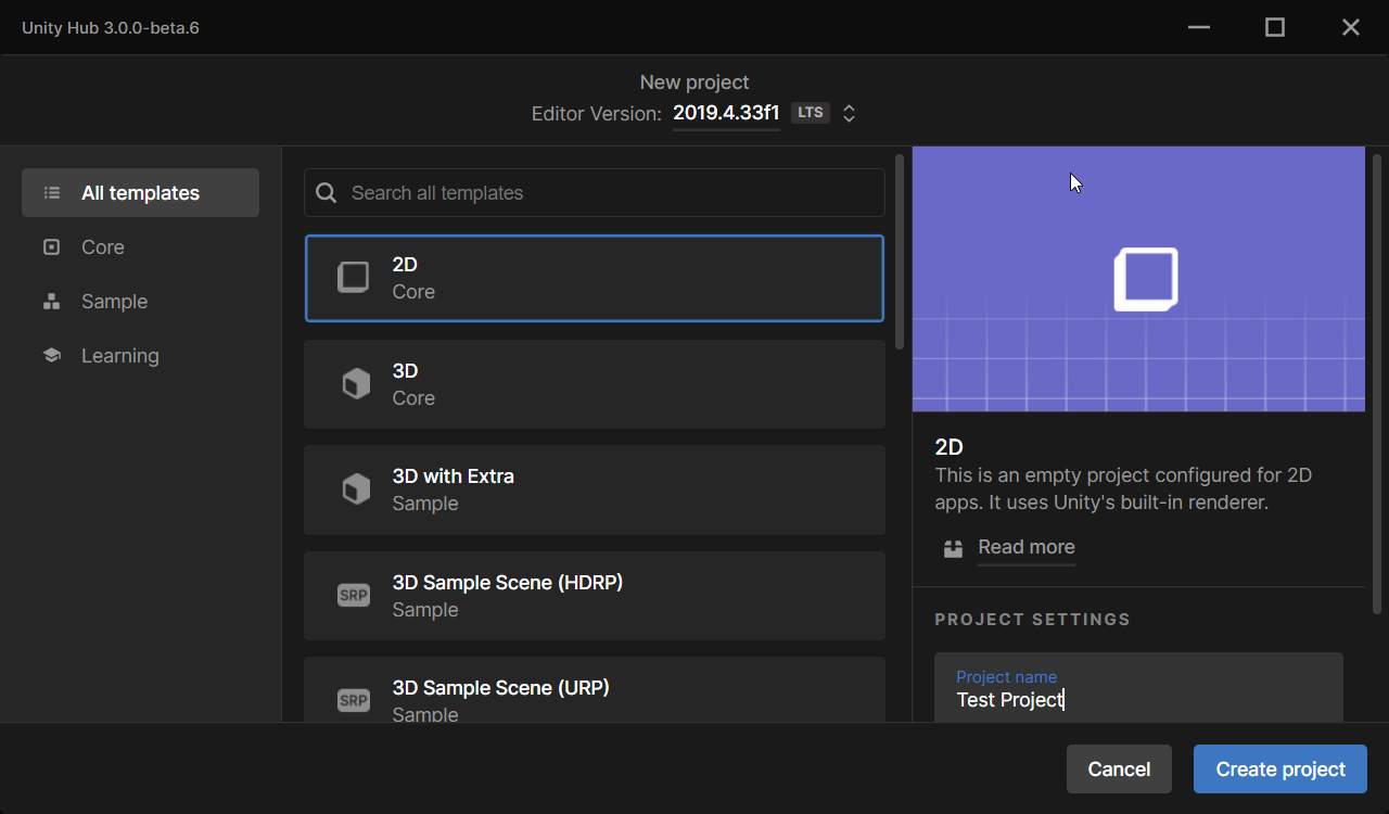 파일명과 템플릿 등을 입력하여 줍시다. 이 프로젝트는 유니티가 어떻게 생겼는지 보기 위함이니 저 같은 경우에는 "Test Project"라는 파일명으로 만들었습니다.