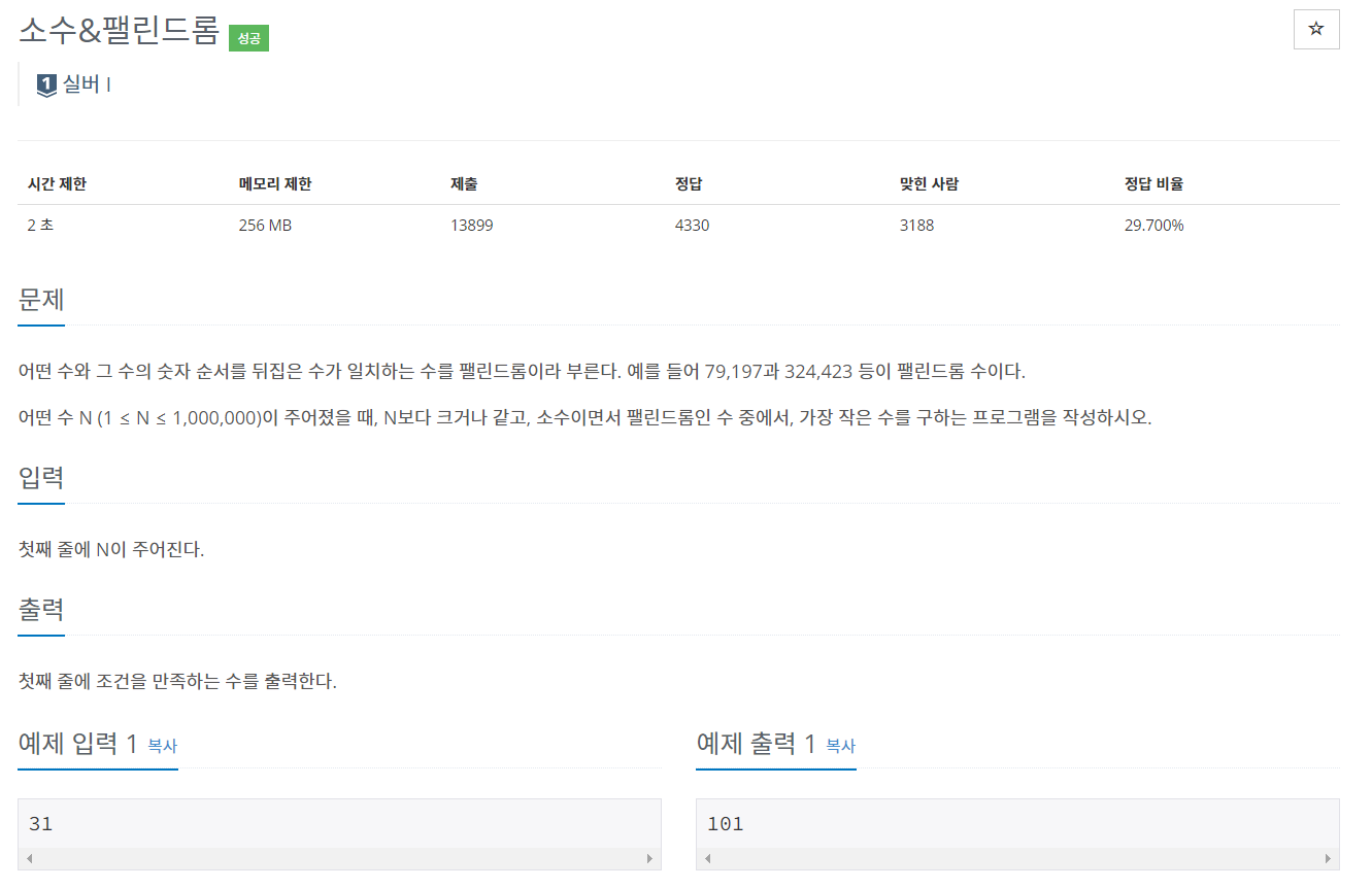 저번에 풀었던 1990번(소수인팰린드롬) 문제랑 상당히 유사한 것 같다. 아니, 사실 거의 똑같다. 그런데 이 문제가 훨씬 쉽다. 근데 솔브닥 티어 차이가 1밖에 안나는 걸로 봐서(1990번은 골드V, 이건 실버I) 티어 책정이 조금 잘못된 것 같다. 1990번은 시간 초과를 막는 것이 상당히 어려워서 골드III 정도가 알맞은 티어 같다.