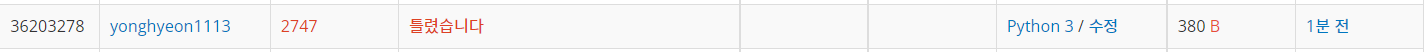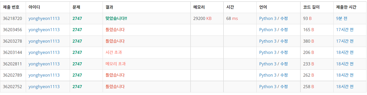 이번에는 리스트 대신에 변수들을 사용해서 메모리를 낮췄다 생각했다. 그래서 다시 제출해봤다.