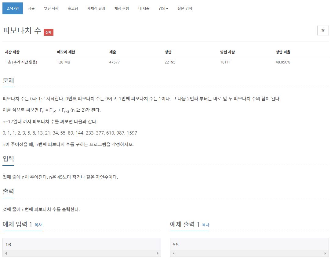 백준의 2747번 문제 풀이이다. 피보나치 수인데, 이런 문제로 굉장히 많이 나와가지고 그냥 한번 풀어 봐야겠다.