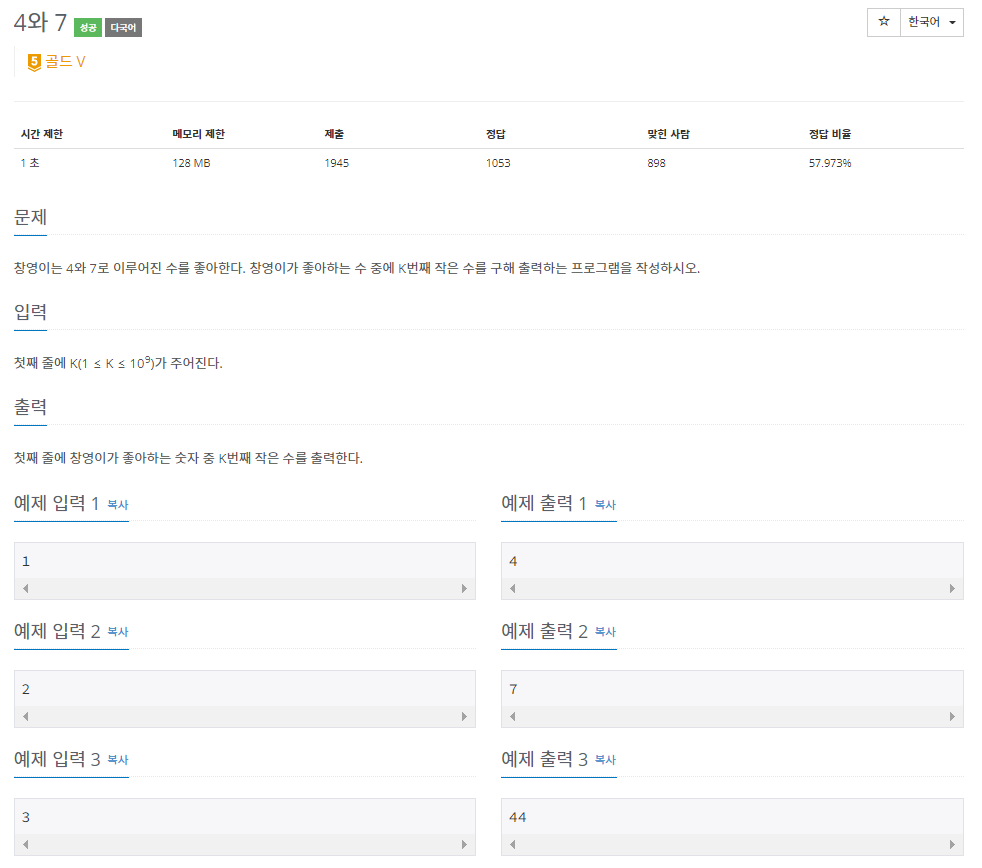 분명 패턴이 있는데 이 패턴을 어떻게 정리하고 구현할지 고민하다가 K+1의 이진수에서 가장 큰 자리수를 없애면 매칭이 된다는 것을 알게 되었다. 즉, K가 5일때 4와 7로 만들 수 있는 5번째 작은 수는 74인데 위의 그림에서 74를 7을 1로 표현하고 4를 0으로 표현한 이진수로 보았을 때 10으로 되어있다. 이때 5+1(=6)의 이진수는 110이고 여기서 가장 큰 자리수인 1을 없애면 10이 남는다. 이 10이란 숫자를 다시 1은 7로, 0은 4로 변환해서 출력해주면 74가 된다.