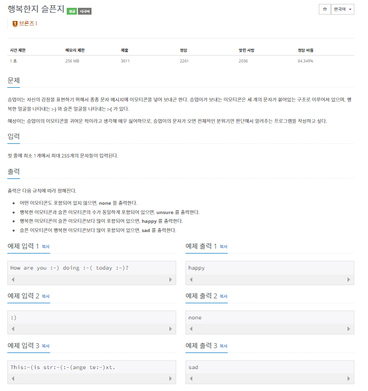 [Python] 백준 10769번(행복한지 슬픈지) 문제 풀이 본문