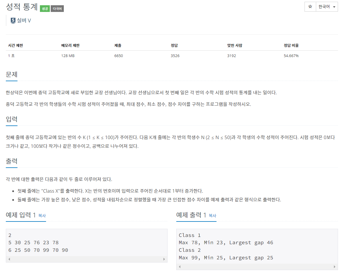[Python] 백준 5800번(성적 통계) 문제 풀이 본문