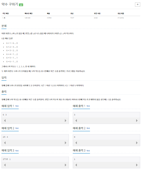 N과 K를 입력받아 N의 약수들 중 K번째 수를 출력하는 문제네요.