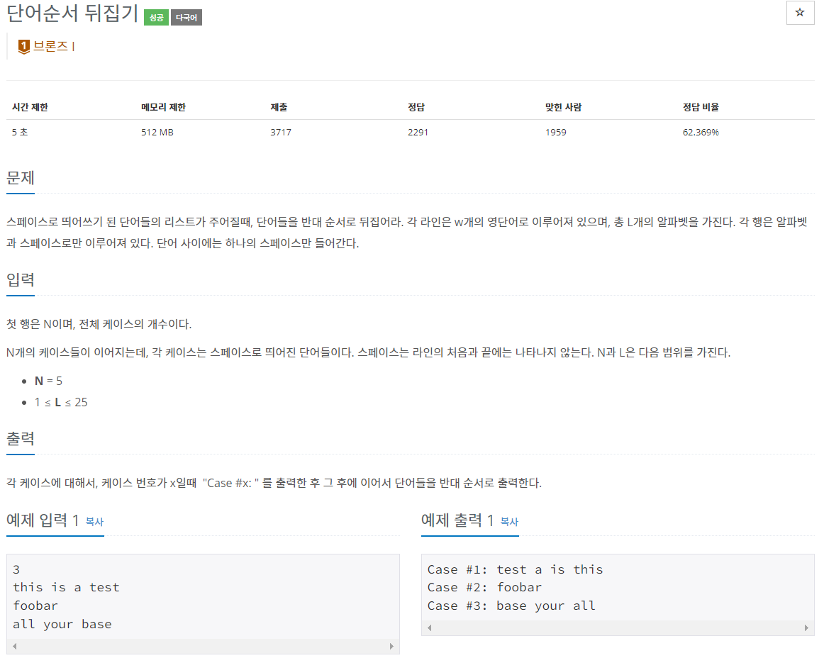 print("Case #%d:"%(i+1), " ".join(list(reversed(input().split(" ")))))'PS > Python' 카테고리의 다른 글
