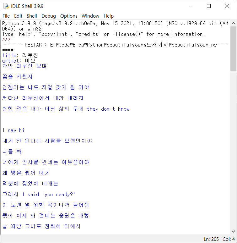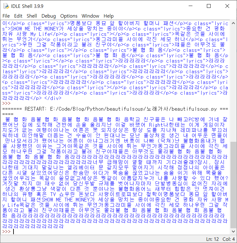 [Python] beautifulsoup를 사용한 웹 크롤링 예제 - 노래 가사 가져오기