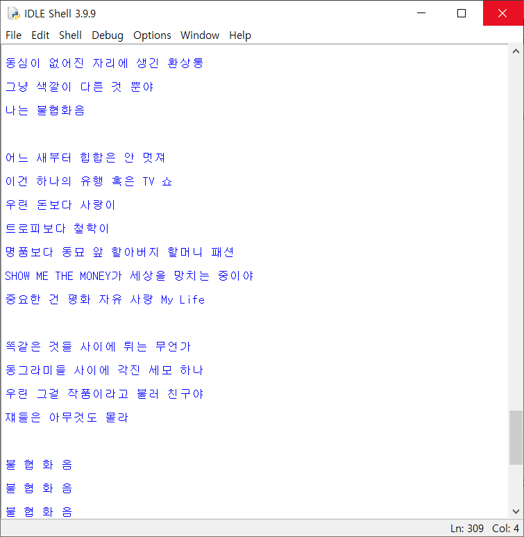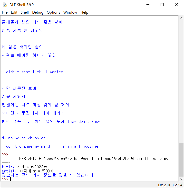 print("찾으시는 곡의 가사 정보를 찾을 수 없습니다.")