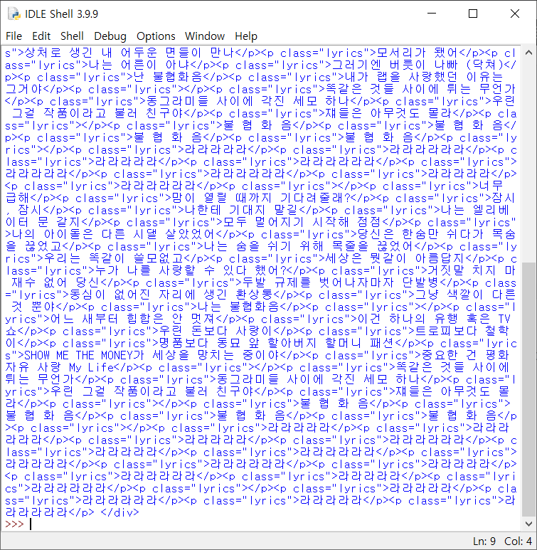 와! 신기하네요. 근데 문제는 이렇게 HTML 그 자체가 나온다는겁니다. 여기서 제가 얻고 싶은건 가사뿐인데. 그래서 .get_text() 함수를 써주었습니다.