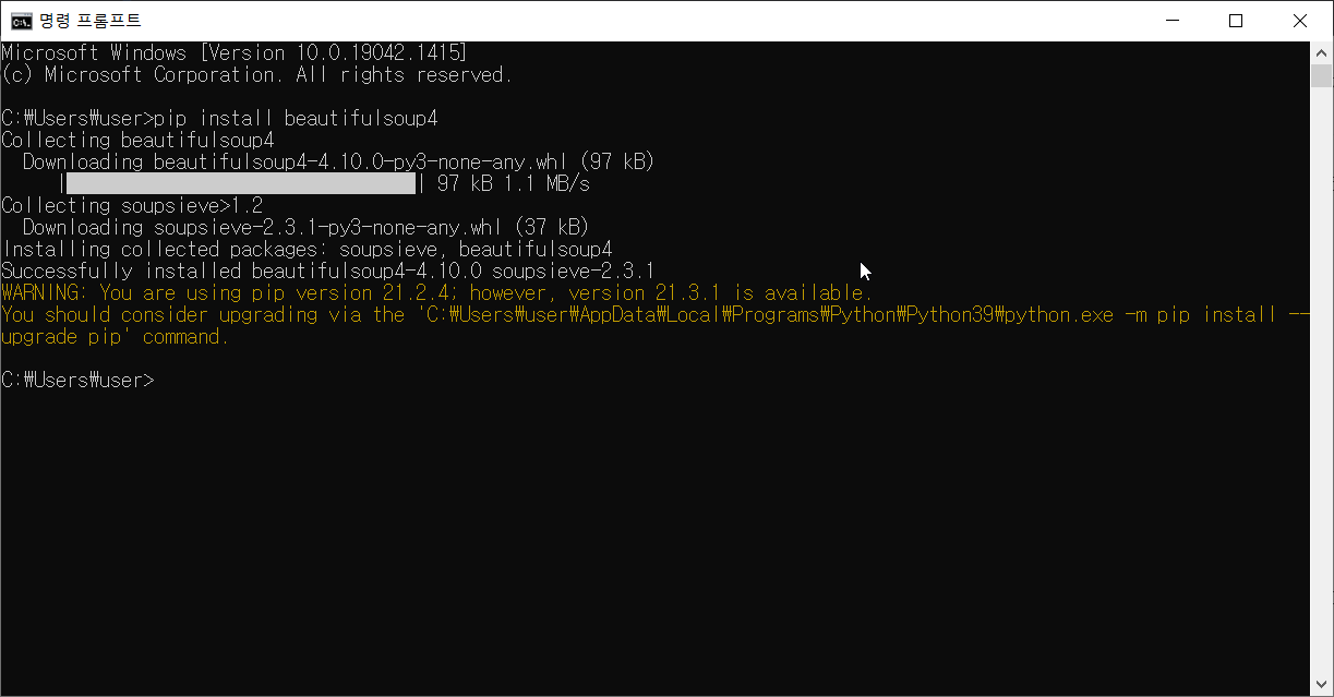 잘 깔렸네요. 그러면 이제 beautifulsoup를 써볼 차례입니다. 위에 링크해놓은 위키독스 페이지에서 친절히 코드를 제공해 주네요.