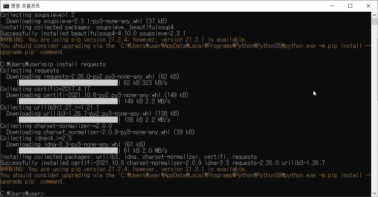 그리고 requests라는 모듈도 깔아야합니다. pip install requests 합시다.