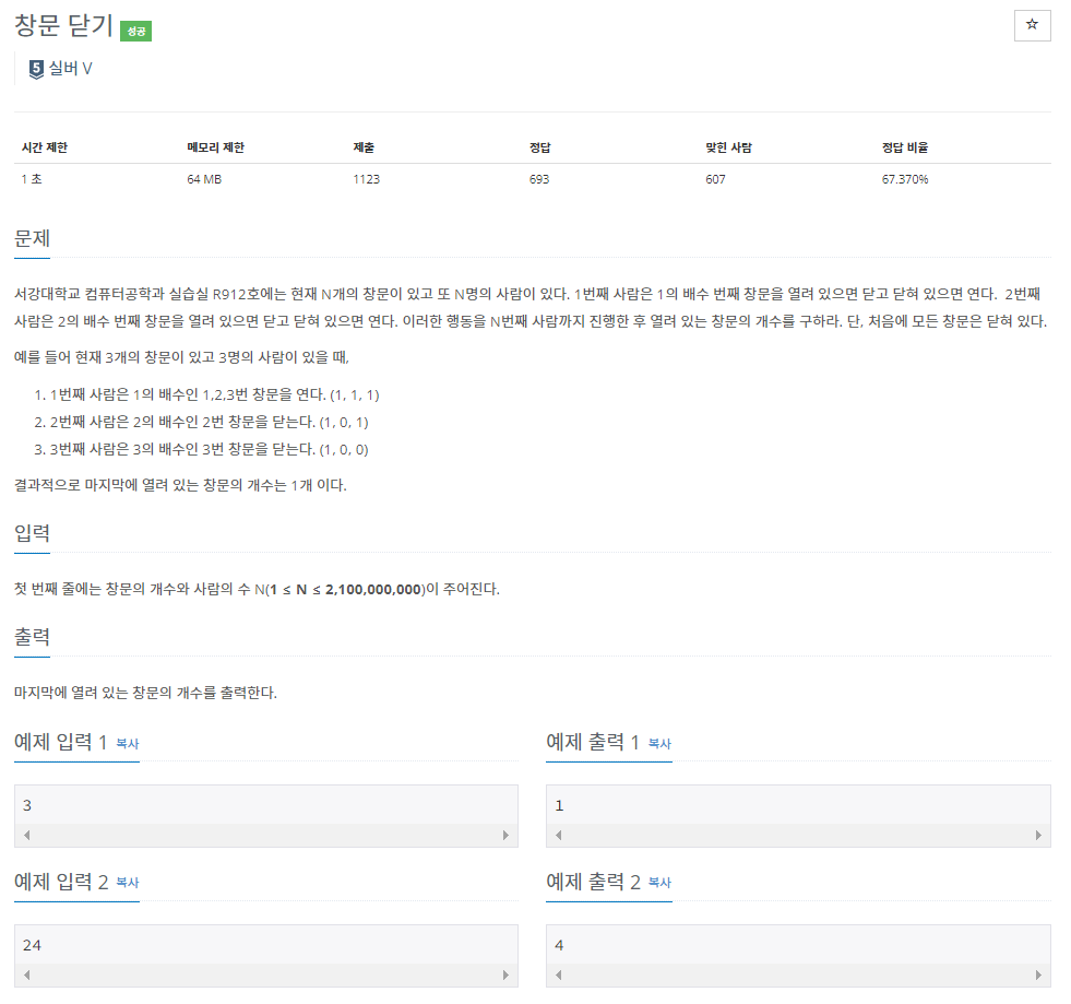[C] 백준 13909번(창문 닫기) 문제 풀이 본문