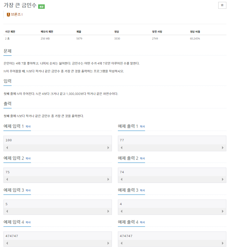 [Python] 백준 1526번(가장 큰 금민수) 문제 풀이 본문