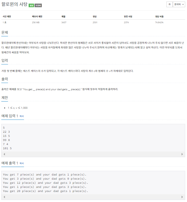 PLU High School Programming Contest 중 <PLU 2014 - Novice>의 9번 문제인 <할로윈의 사탕>이다. 30살이 넘어서도 사탕을 가지고 싸우는 형제들의 이야기...
