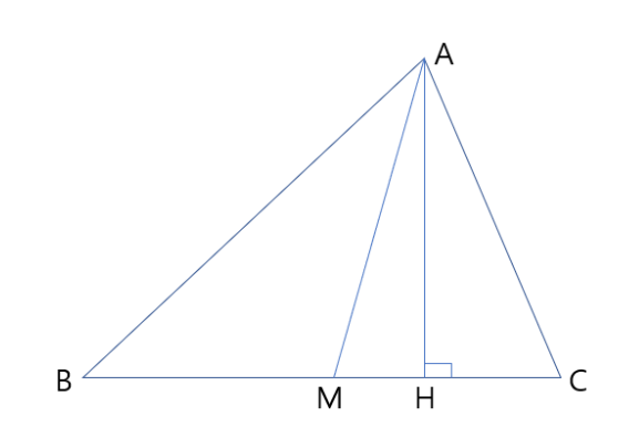 위와 같은 삼각형 ABC의 A에서 선분 BC에 내린 중점 M과 A에서 선분 BC에 내린 수선의 발 H에 관해서 다음과 같은 식이 성립한다.