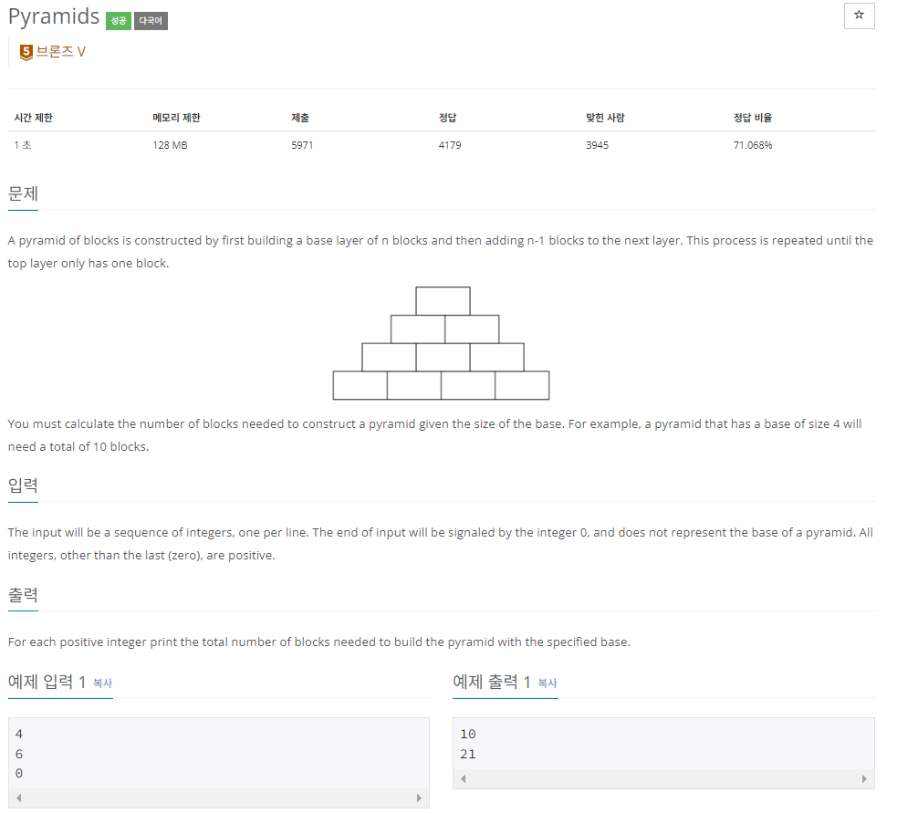 피라미드를 쌓는데에 윗칸부터 {1, 2, 3, 4, ..., n-2, n-1, n} 개의 블록이 쓰일 것이므로 공차가 1인 등차수열의 합 공식을 사용하여 문제를 풀어 주면 된다.