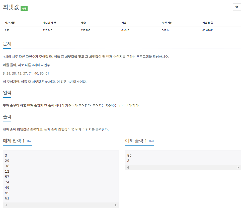 굉장히 친절한 문제이다. 입력받은 수 9개 중에서 가장 큰 것과 그게 몇번째로 입력됐는지 출력하면 된다.