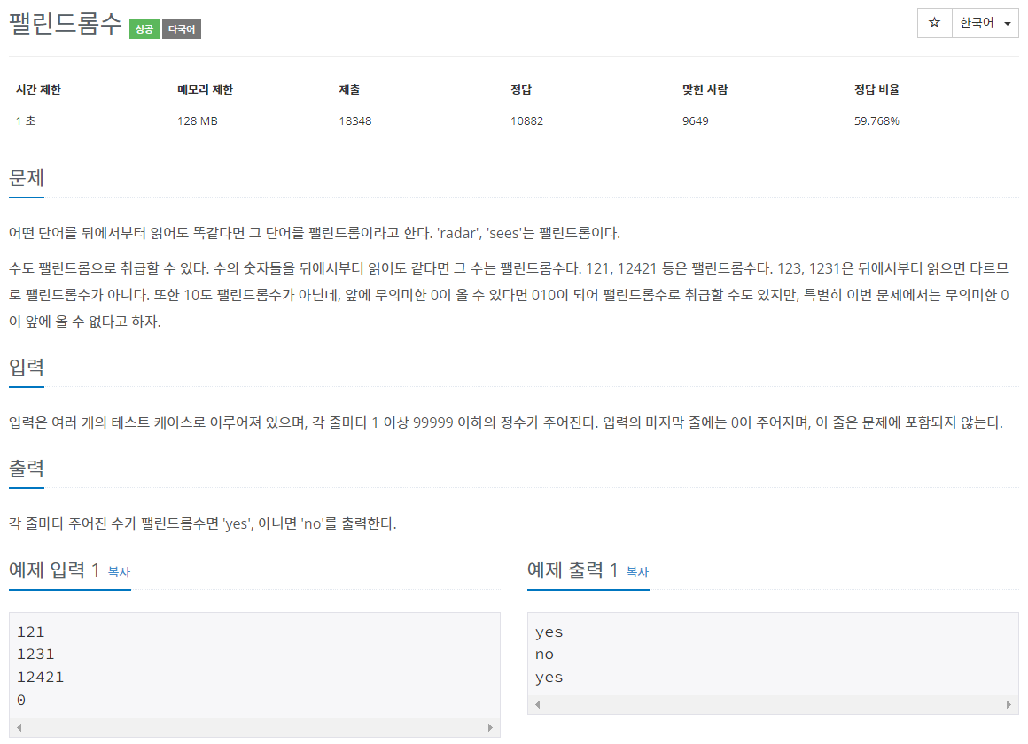 위키백과에서 인용했다. 이 문제는 입력받은 수가 팰린드롬인가 아닌가를 판별하는 문제이다.