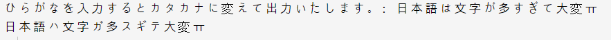 이렇게 히라가나는 가타카나로 바꾸어 출력되고, 가타카나로 바꿀 수 없는 한자, 한국어, 영어 등은 아까 for()문에서 if를 써 줬기에 그냥 출력된다.