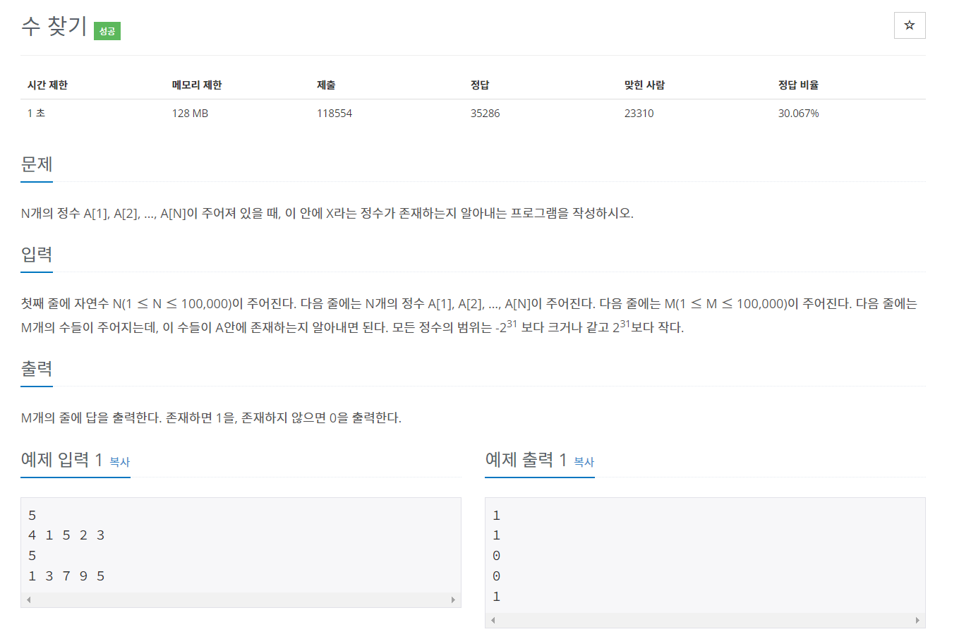파이썬의 in 기능을 활용하면 풀릴 것 같아 그렇게 풀었더니 시간 초과가 떴다. 그래서 보니 이 문제는 이진 탐색 알고리즘을 사용해야 풀리는 문제였다.