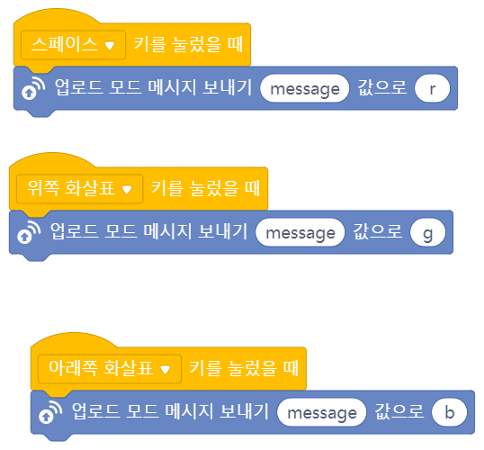 위쪽 화살표 키를 누르면 G, 아래쪽 화살표 키를 누르면 B, 스페이스 키를 누르면 R 불이 켜지게 만들었는데, 키보드는 스프라이트만 인식할 수 있기 때문에 스프라이트에서 입력받은걸 OrangeBoard로 전하는 식으로 만들었다.